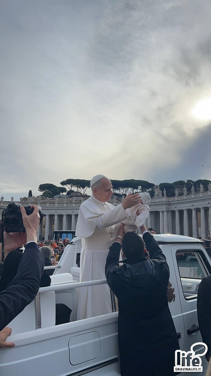 E così i pellegrini gravinesi, sono arrivati mentre faceva giorno e hanno atteso l'apertura dei varchi di sicurezza per accedere a Piazza San Pietro. In una fresca mattinata, riscaldata poi da un timido sole che ha concesso un leggero tepore, nella piazza San Pietro si è vista arrivare la Papa mobile del Santo Padre, e per l'occasione la più piccola dei pellegrini gravinesi, M. P. di appena 2 mesi, è stata accolta tra le braccia di Papa Leone XIV per una benedizione.